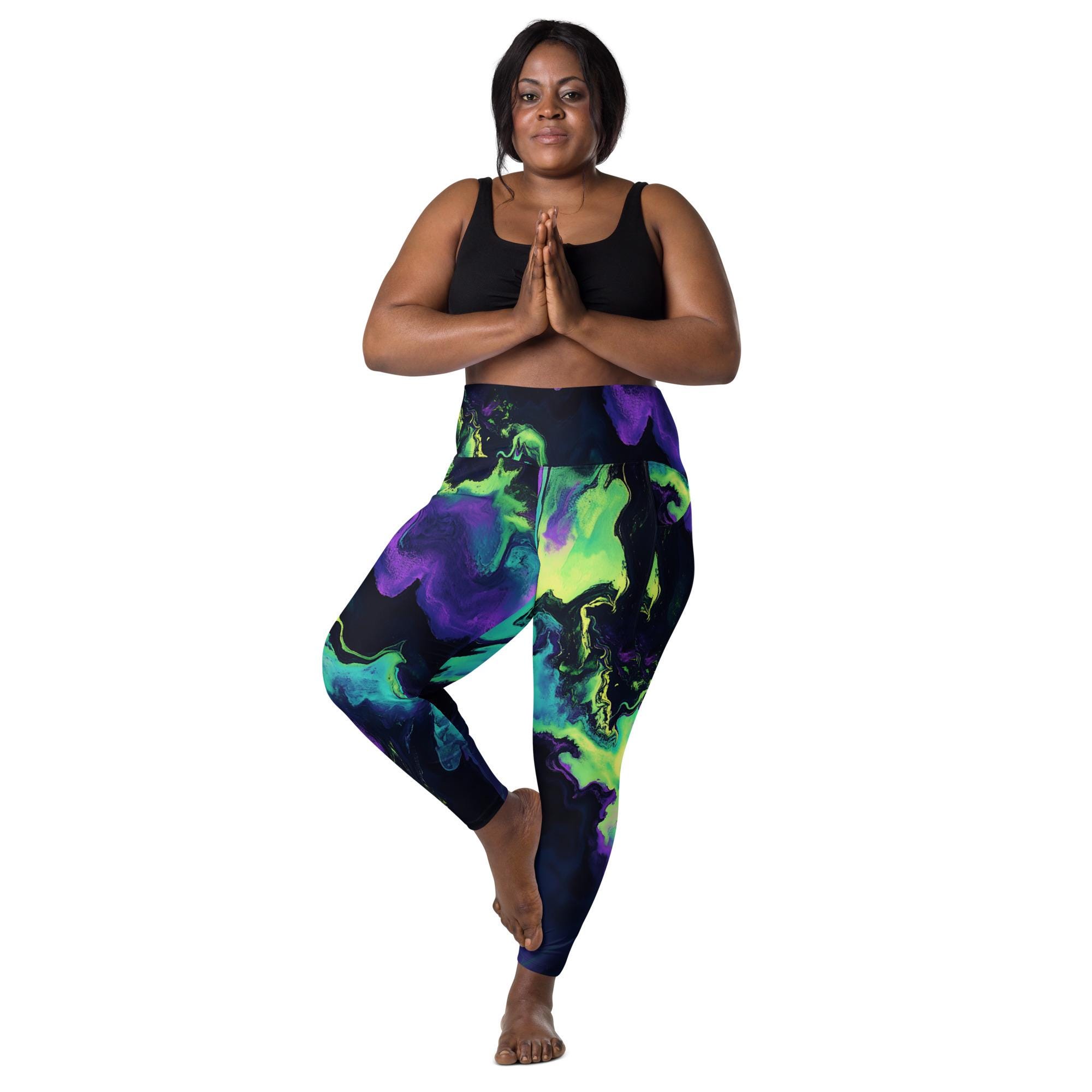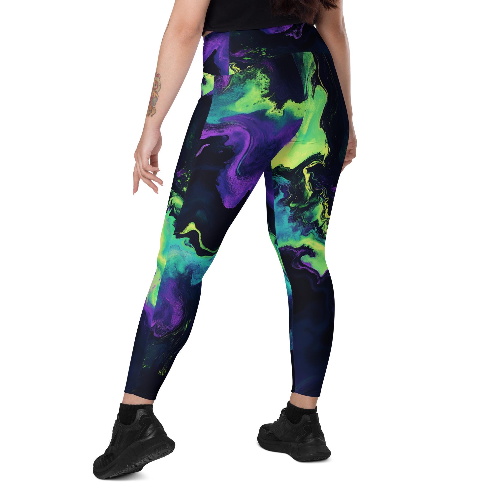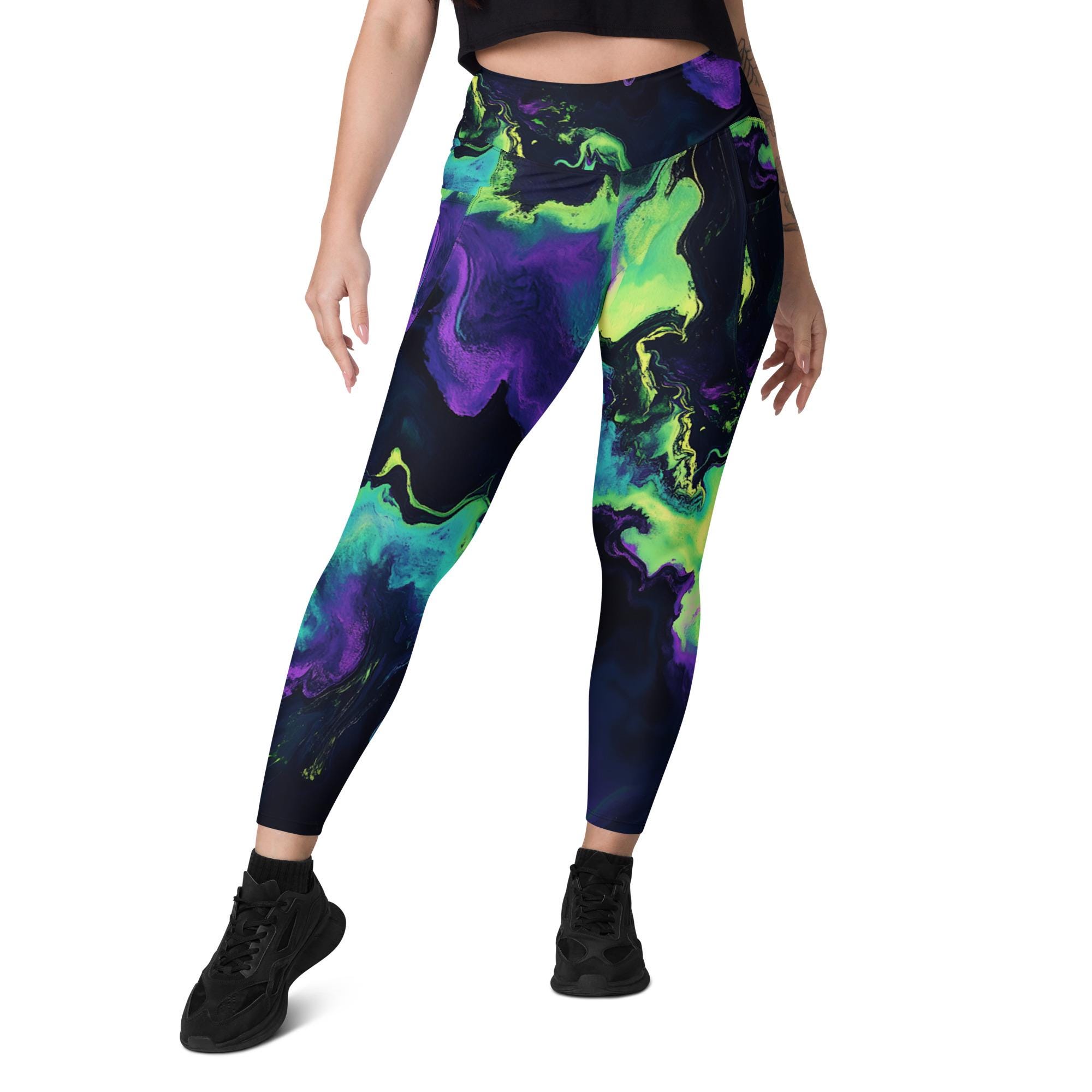 Elevate your activewear collection with these eye-catching Neon Green Purple Leggings with pockets. Designed for both style and functionality, these high-waisted, semi-compression leggings are perfect for workouts, yoga sessions, or casual city strolls. The vibrant neon green and purple marbled pattern adds a bold pop of color to any outfit, making you stand out wherever you go.