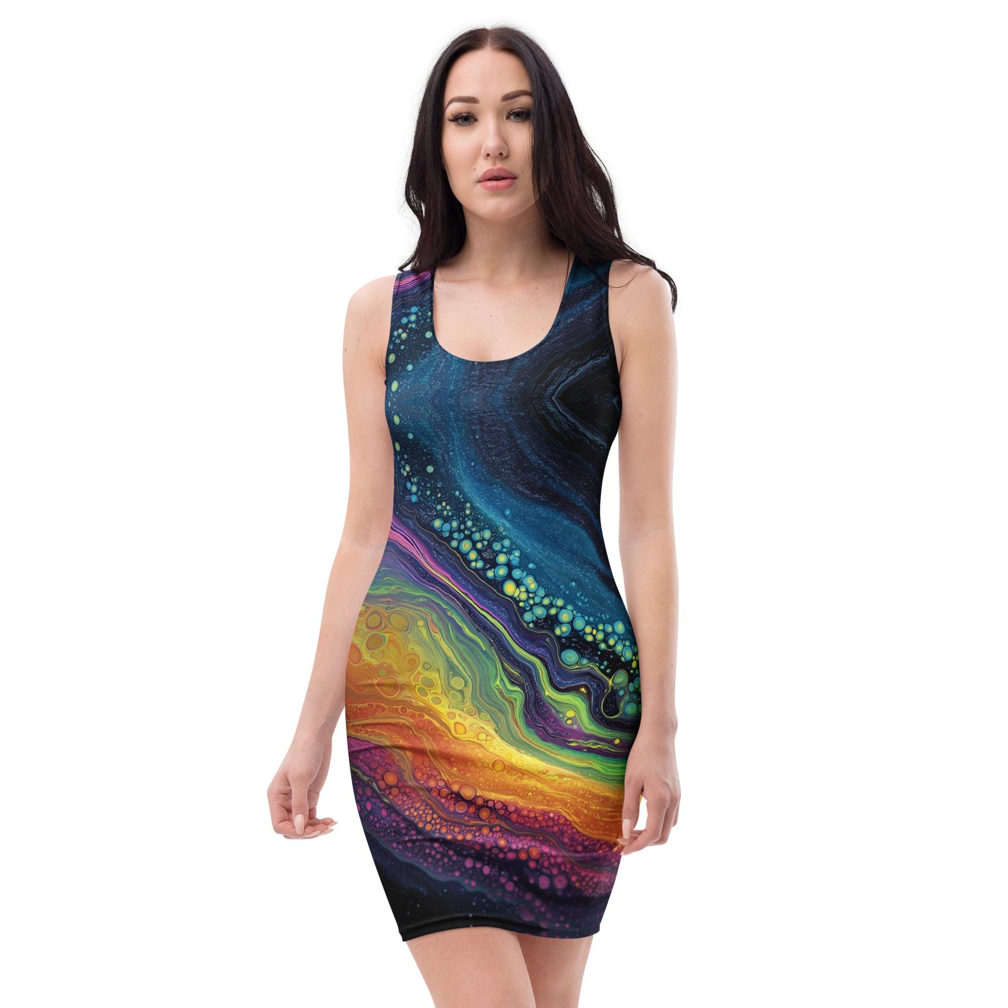 Get ready to turn heads with this stunning Rainbow Bodycon Dress, the perfect all-over printed fitted dress for summer parties, events, or just making a bold fashion statement. Crafted from a smooth, stretch microfiber fabric, this vibrant dress offers both style and comfort, ensuring you look fabulous while feeling great all day or night long.