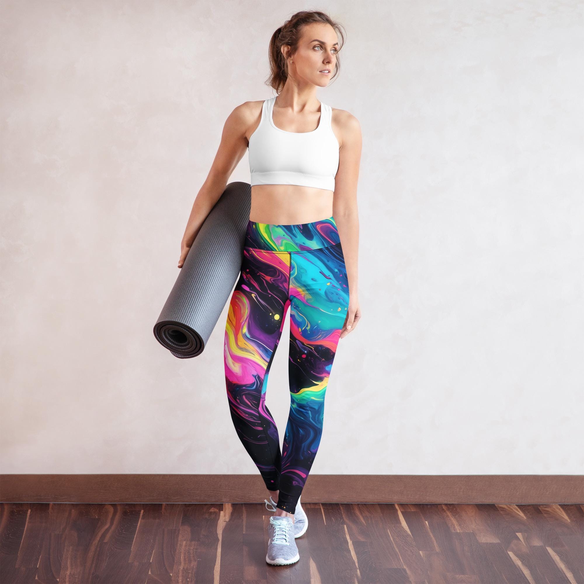 Elevate your workout wardrobe with these vibrant and comfortable yoga leggings for women. Designed for both style and performance, these high-waisted leggings feature a stunning colorful abstract print that adds a pop of personality to any activewear collection. Perfect for yoga, fitness classes, or casual wear, they combine functionality with eye-catching design.