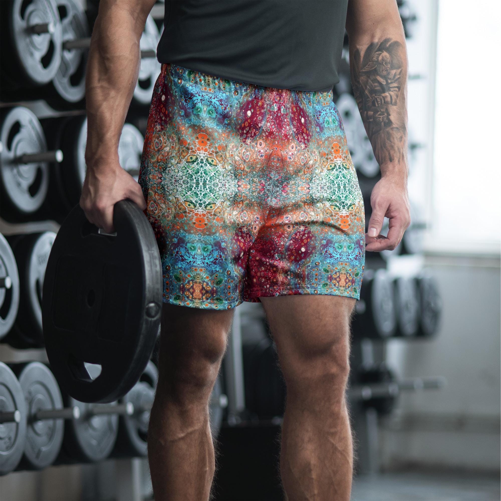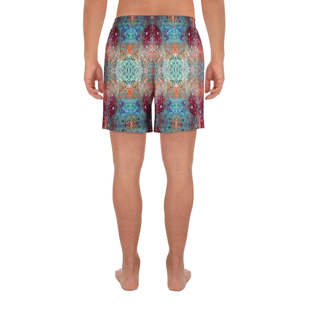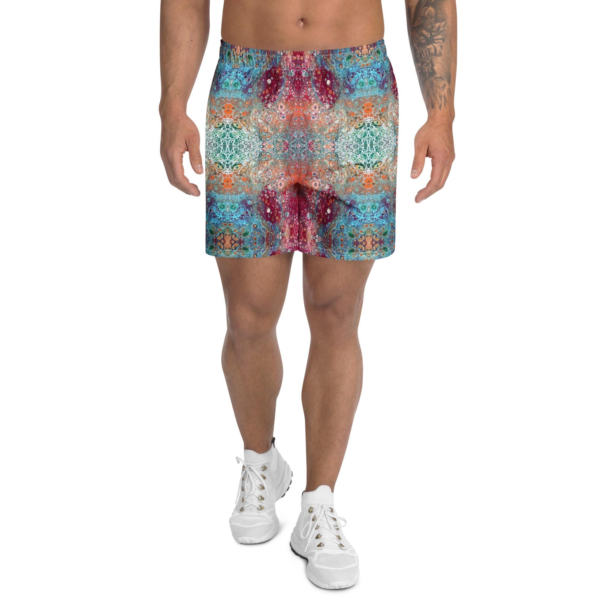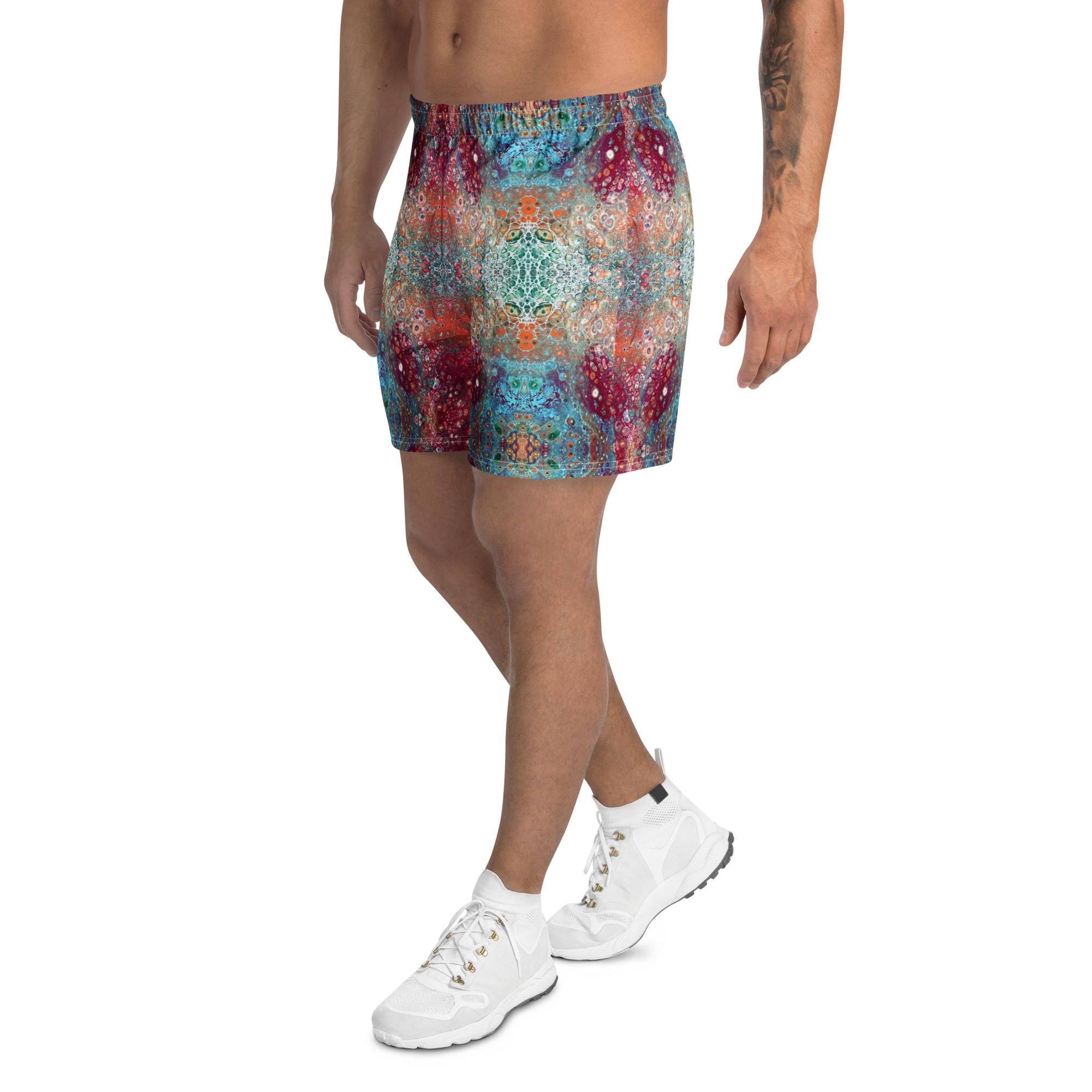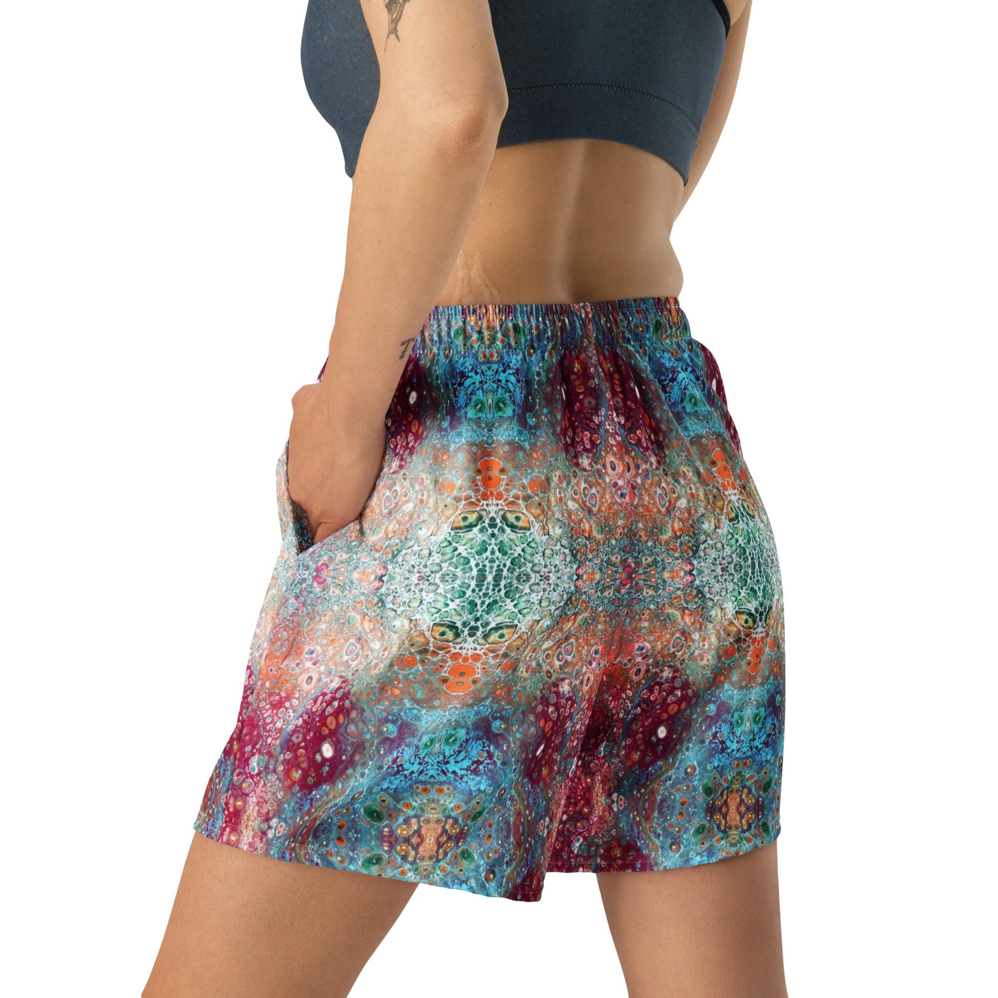 Key features include: * 6.3 inch (16 cm) inseam for a flattering fit * Elastic waistband with a flat white drawstring for adjustable comfort * Eco-friendly construction with recycled materials * Durable fabric weight of 5.13 oz. per square yard (174 g/m²) * Vibrant psychedelic sacred geometry mandala design that stands out in any crowd