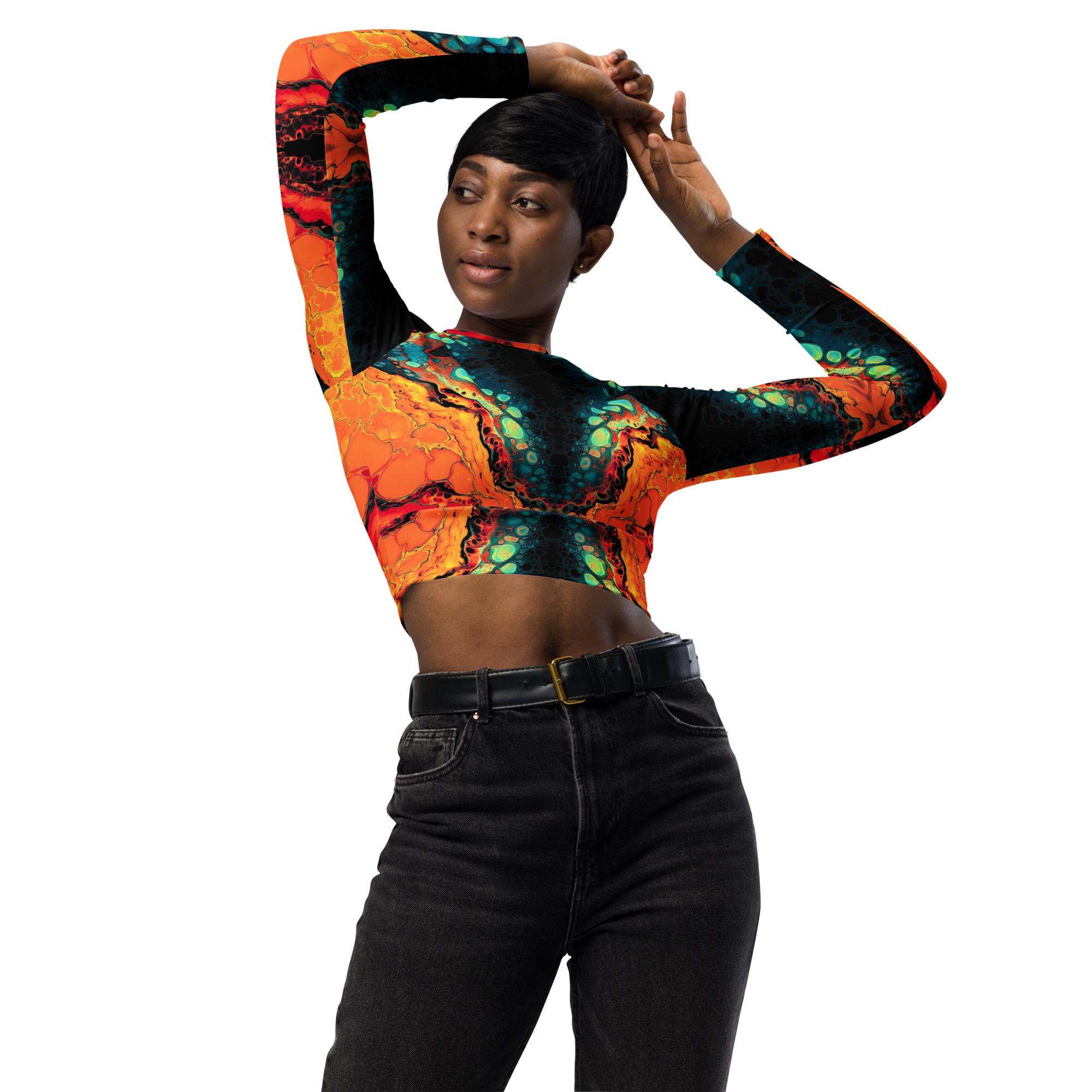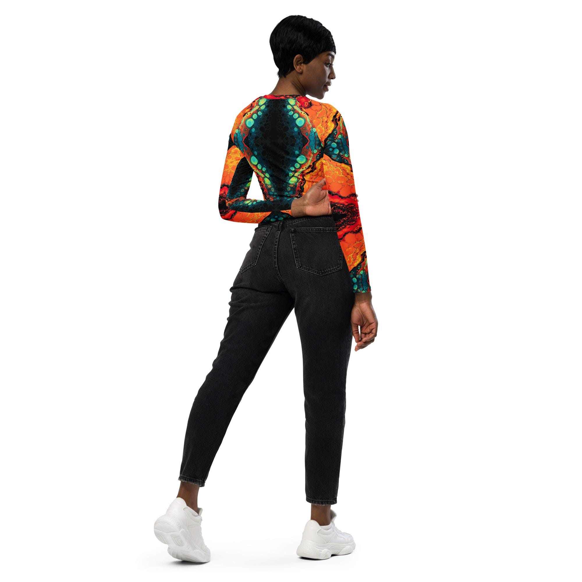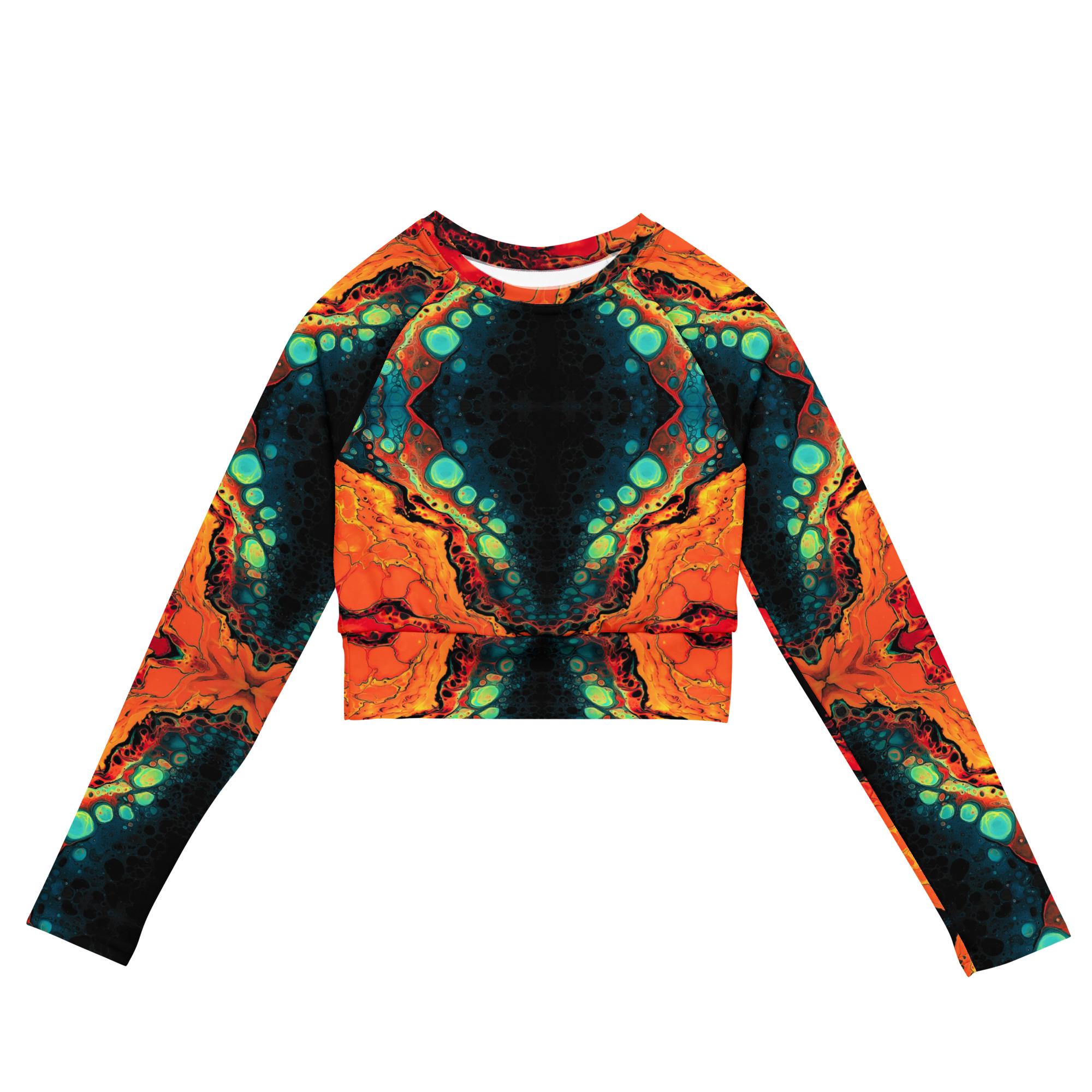 Key features include: * Vibrant, psychedelic lava lamp inspired design in fiery reds, oranges, and blues * Made from eco-friendly recycled polyester and elastane for sustainability and stretch * Long-sleeve crop top perfect for festivals, raves, or energetic workouts * Wide, double-layered waistband for a secure, comfortable fit * Tear-away care label for irritation-free wear