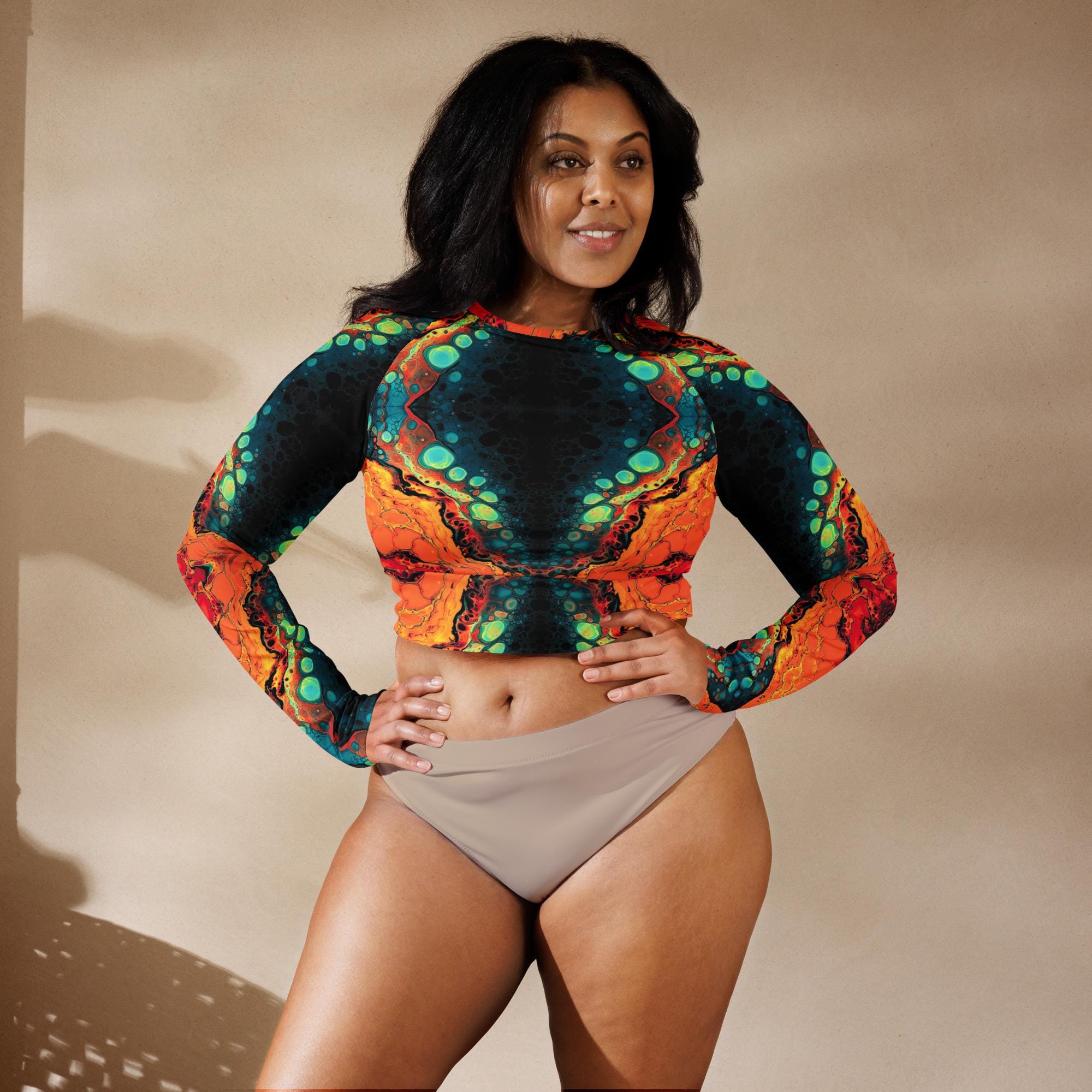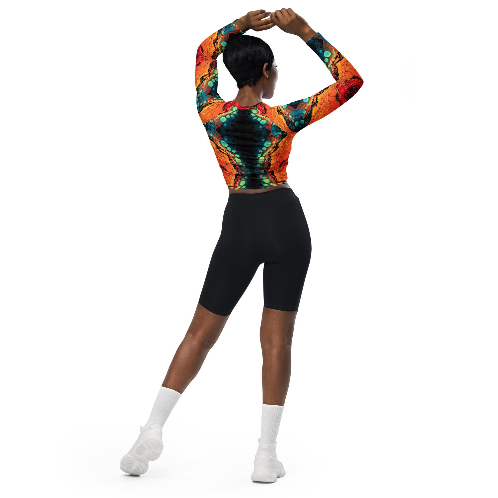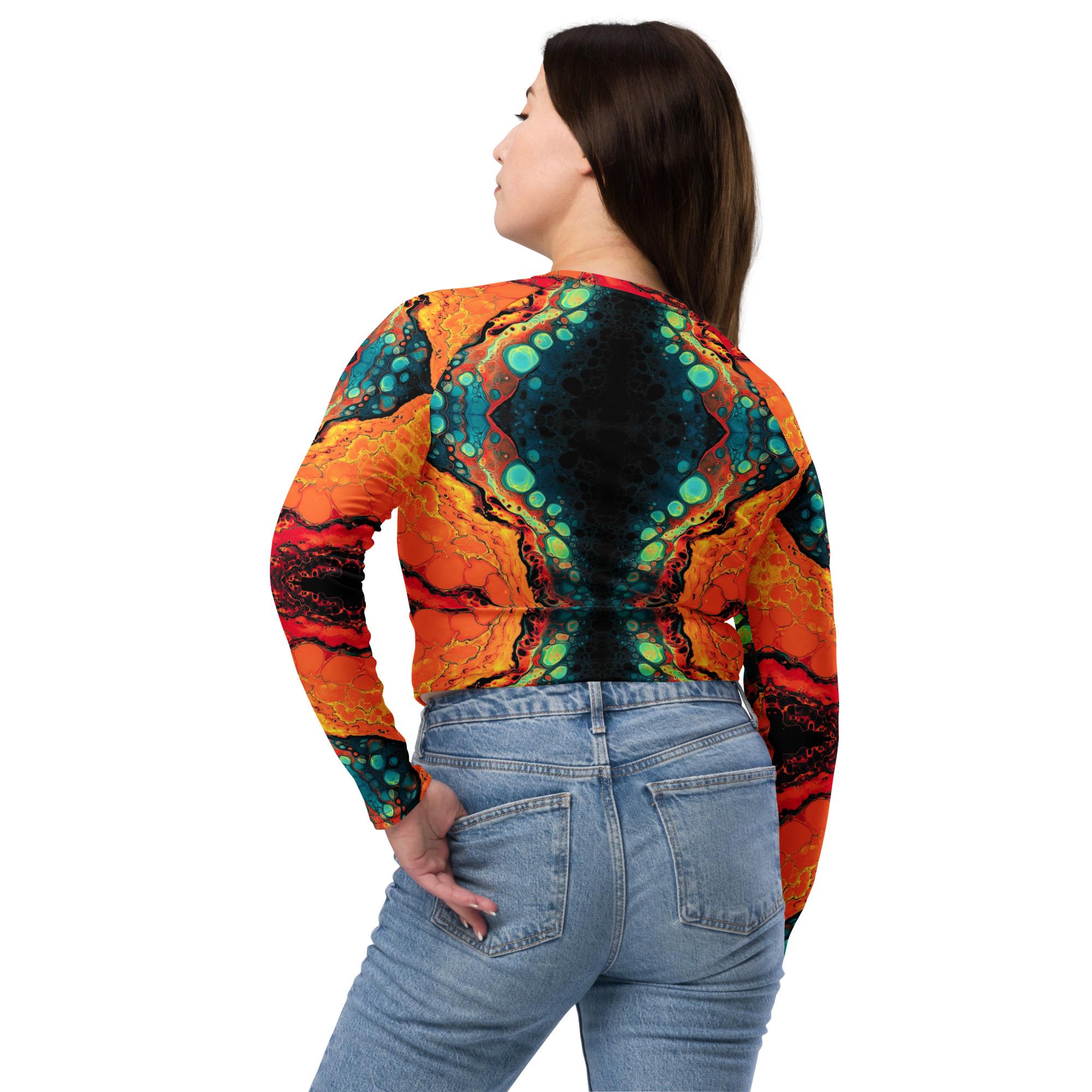 Key features include: * Vibrant, psychedelic lava lamp inspired design in fiery reds, oranges, and blues * Made from eco-friendly recycled polyester and elastane for sustainability and stretch * Long-sleeve crop top perfect for festivals, raves, or energetic workouts * Wide, double-layered waistband for a secure, comfortable fit * Tear-away care label for irritation-free wear