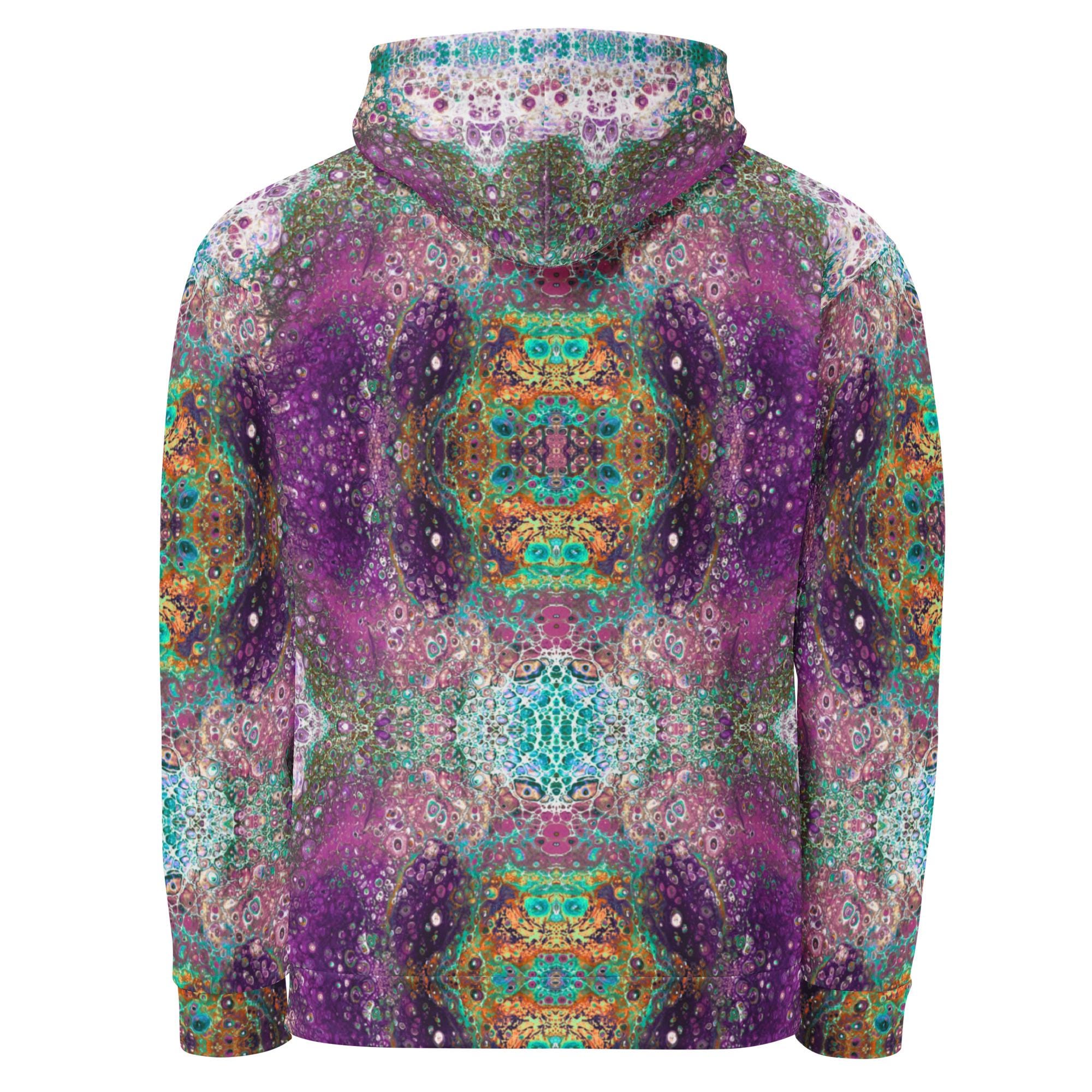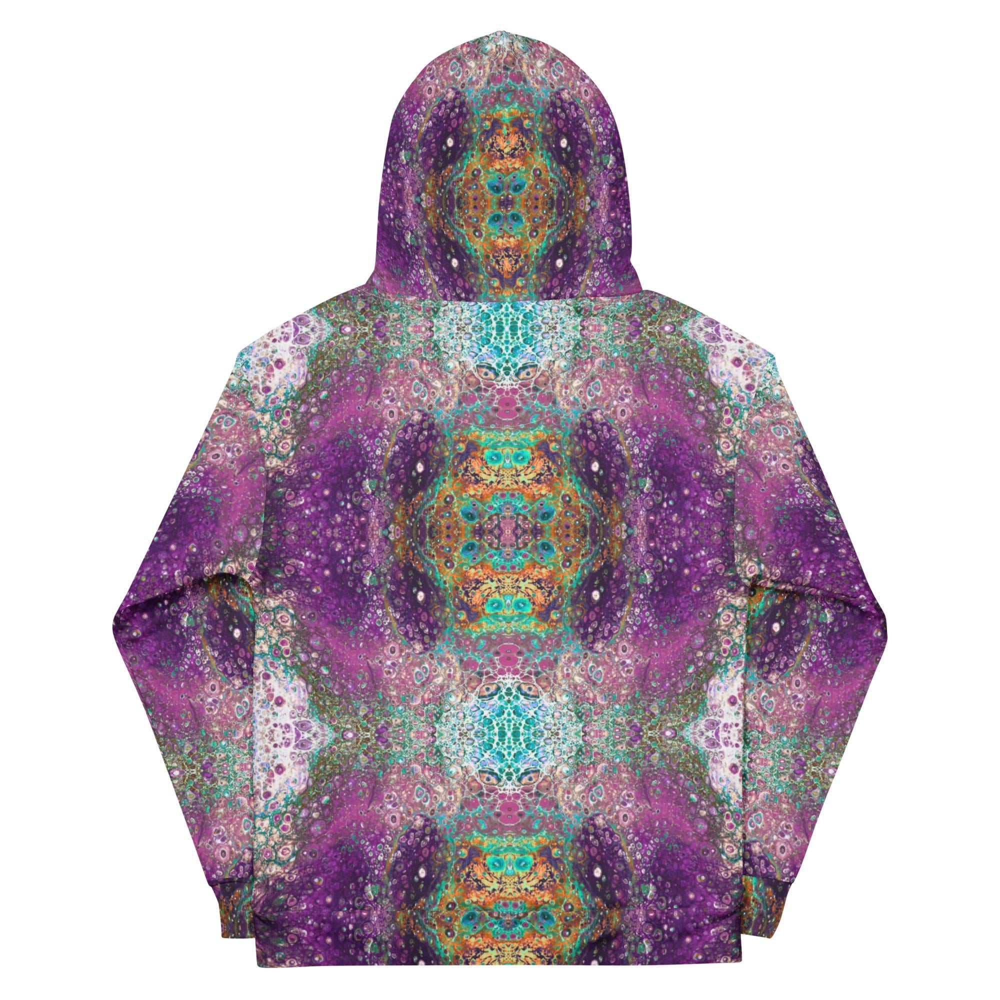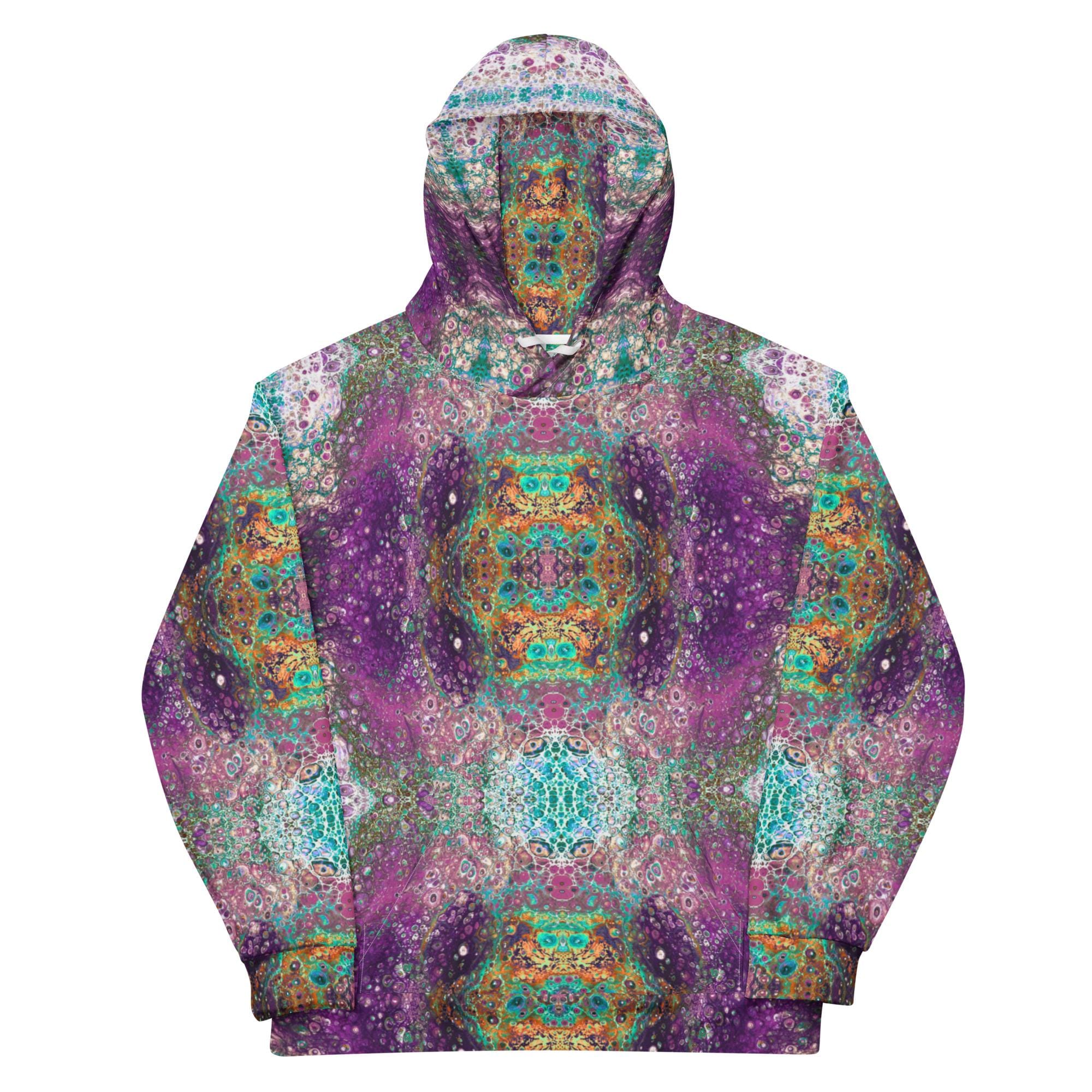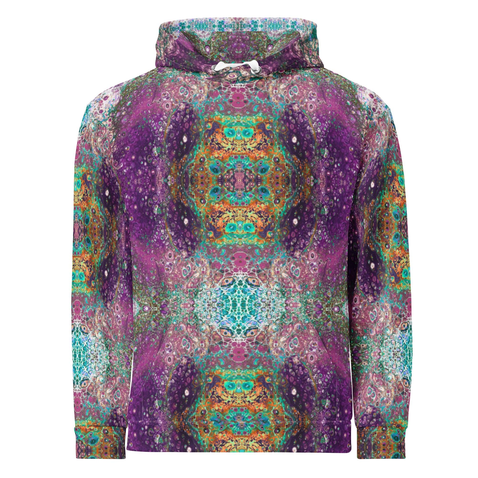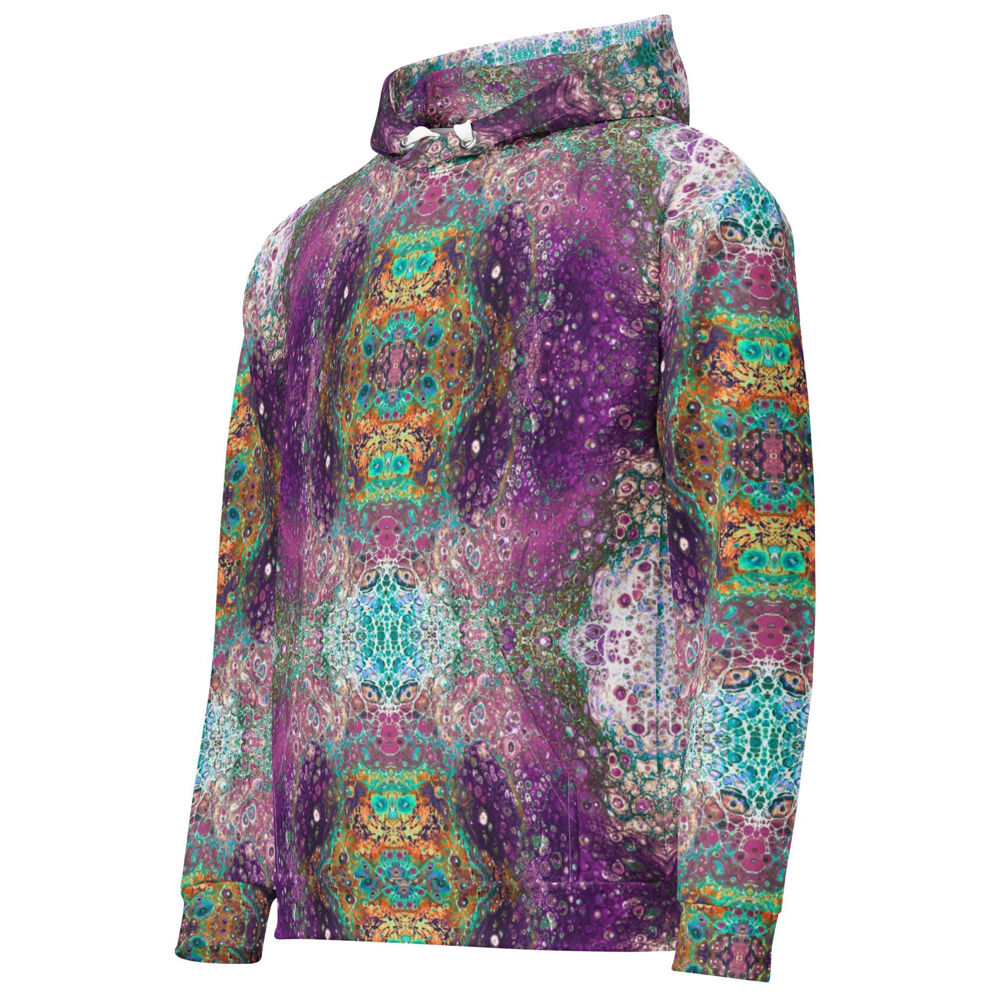 Key features include: * Bright, psychedelic mandala print in shades of purple, turquoise, and gold * Made from eco-friendly recycled polyester and stretchy spandex blend * Soft brushed fleece interior for added warmth and comfort * Double-lined hood with design on both sides * Unisex style with adjustable drawstrings * Durable overlock seams for long-lasting wear * Fabric weight of 9.08 oz./yd.² (308 g/m²) for a substantial feel