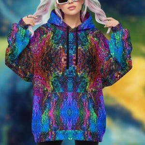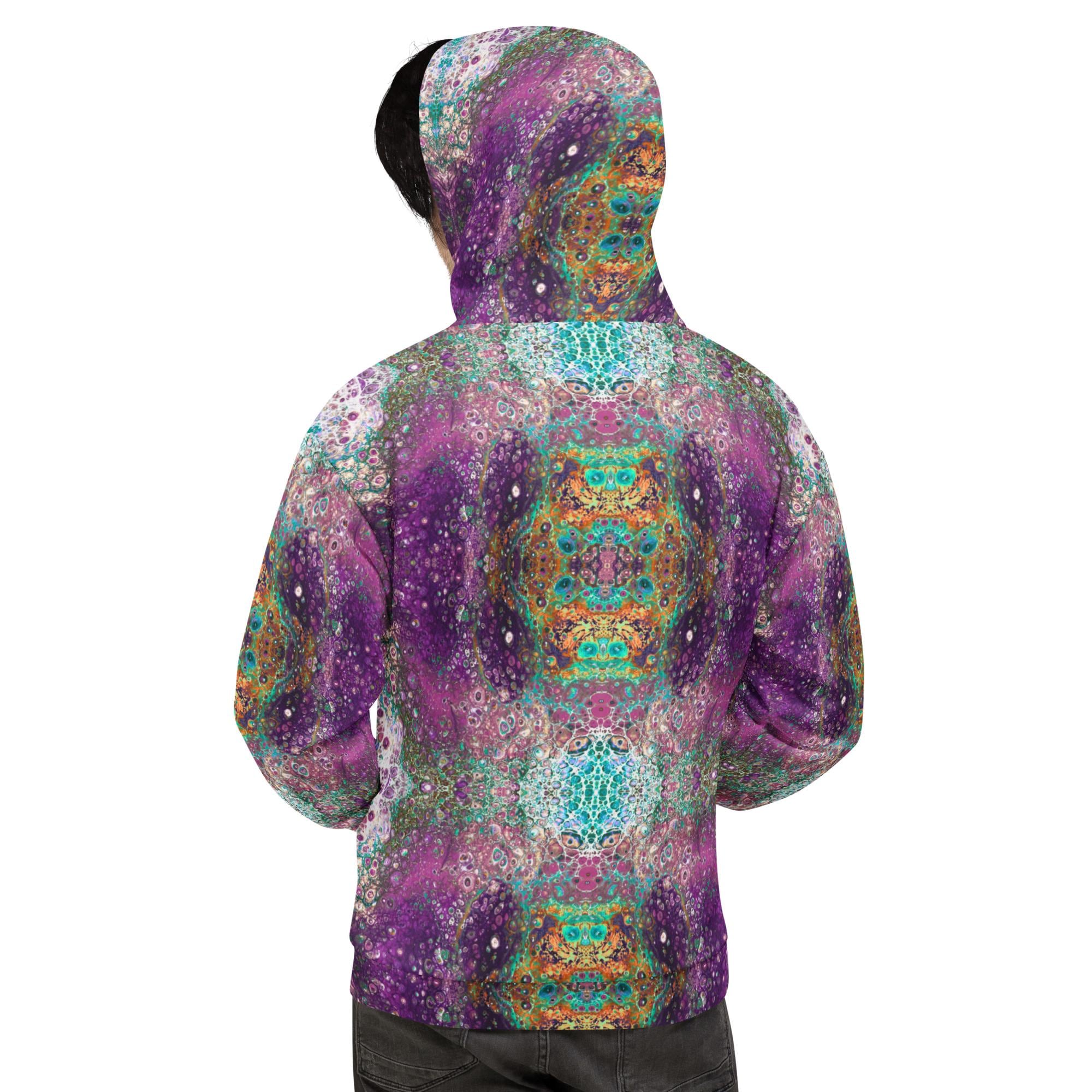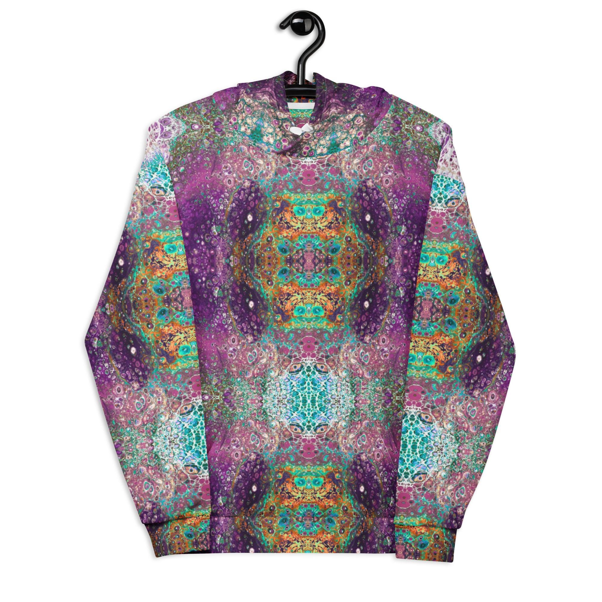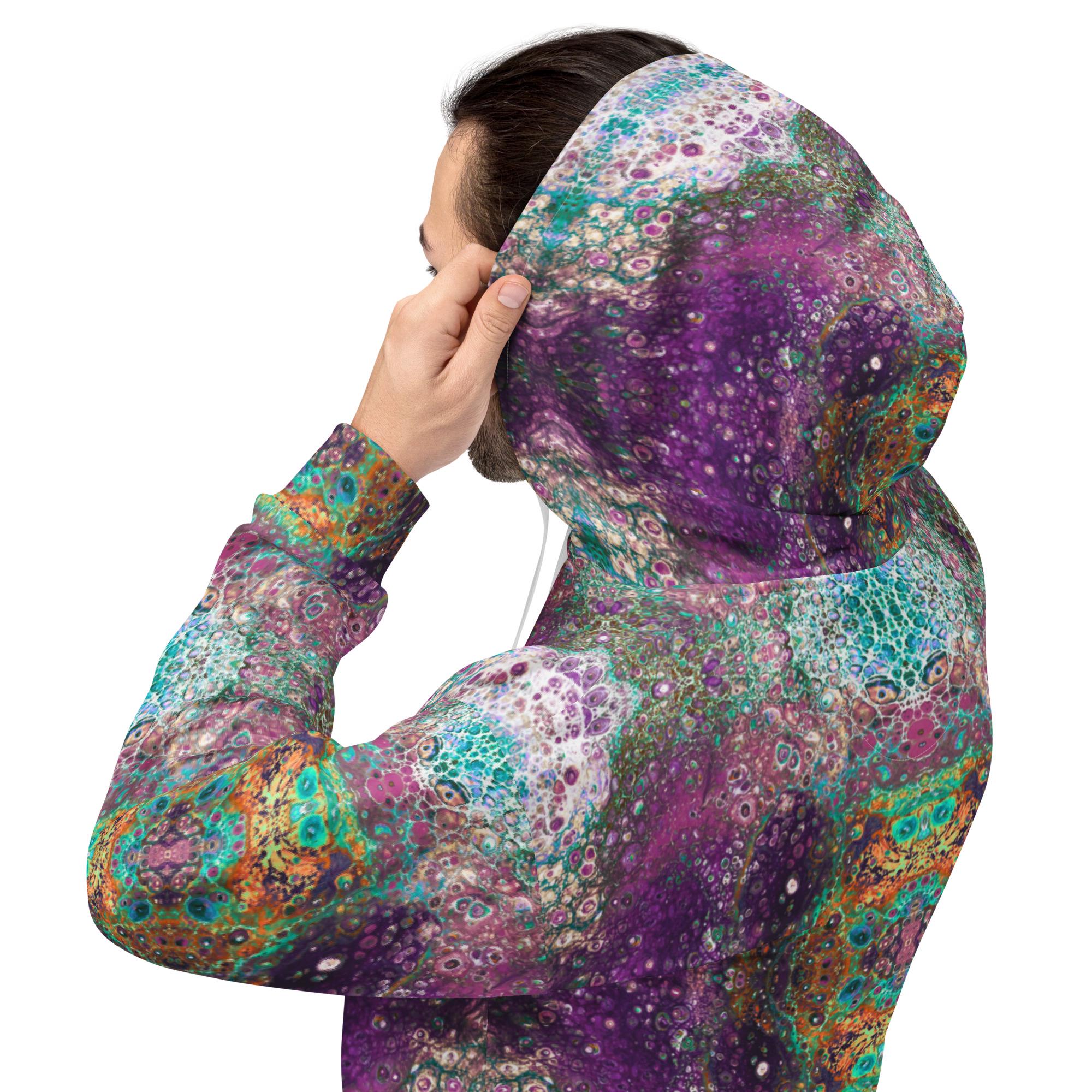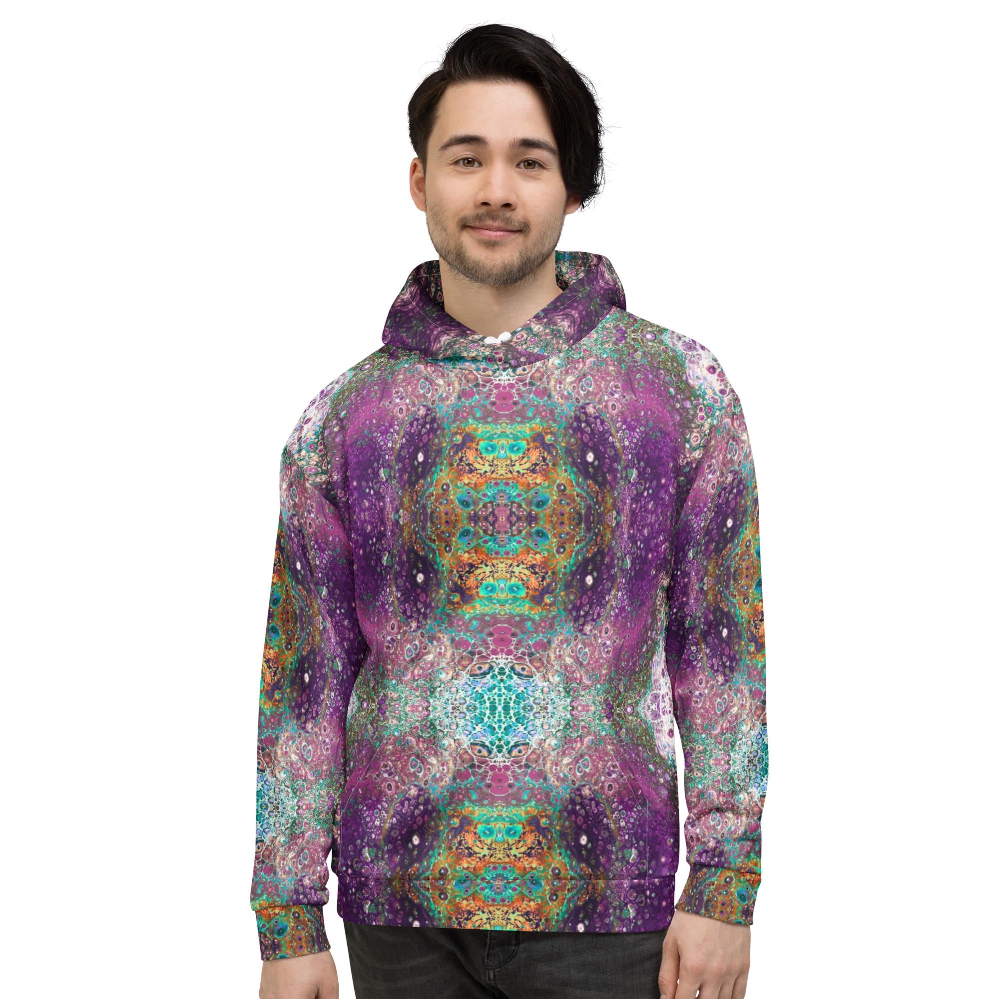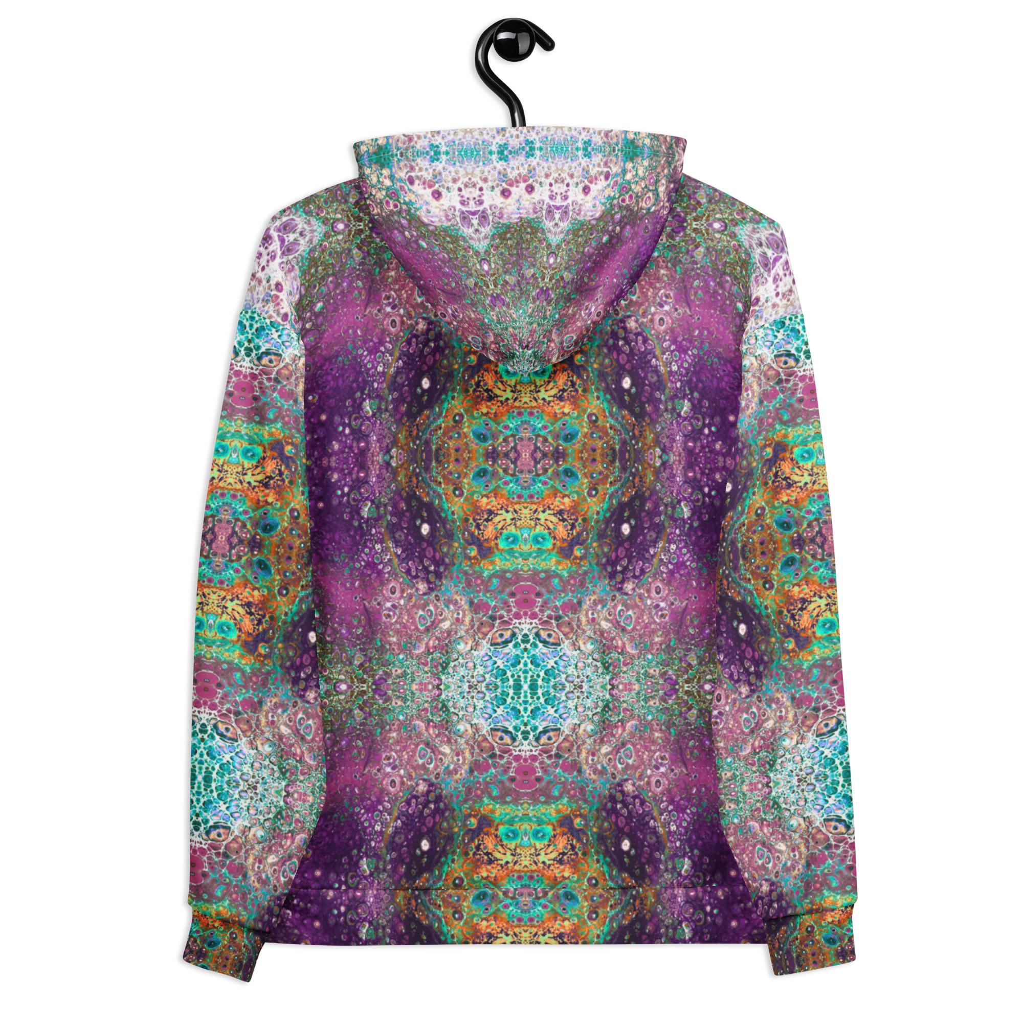 Key features include: * Bright, psychedelic mandala print in shades of purple, turquoise, and gold * Made from eco-friendly recycled polyester and stretchy spandex blend * Soft brushed fleece interior for added warmth and comfort * Double-lined hood with design on both sides * Unisex style with adjustable drawstrings * Durable overlock seams for long-lasting wear * Fabric weight of 9.08 oz./yd.² (308 g/m²) for a substantial feel