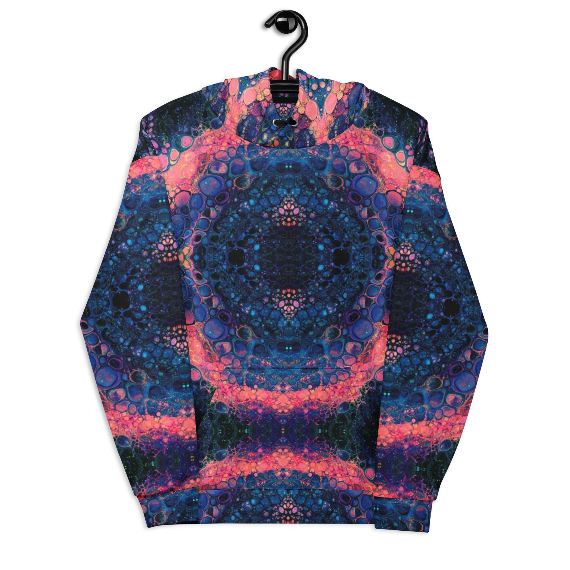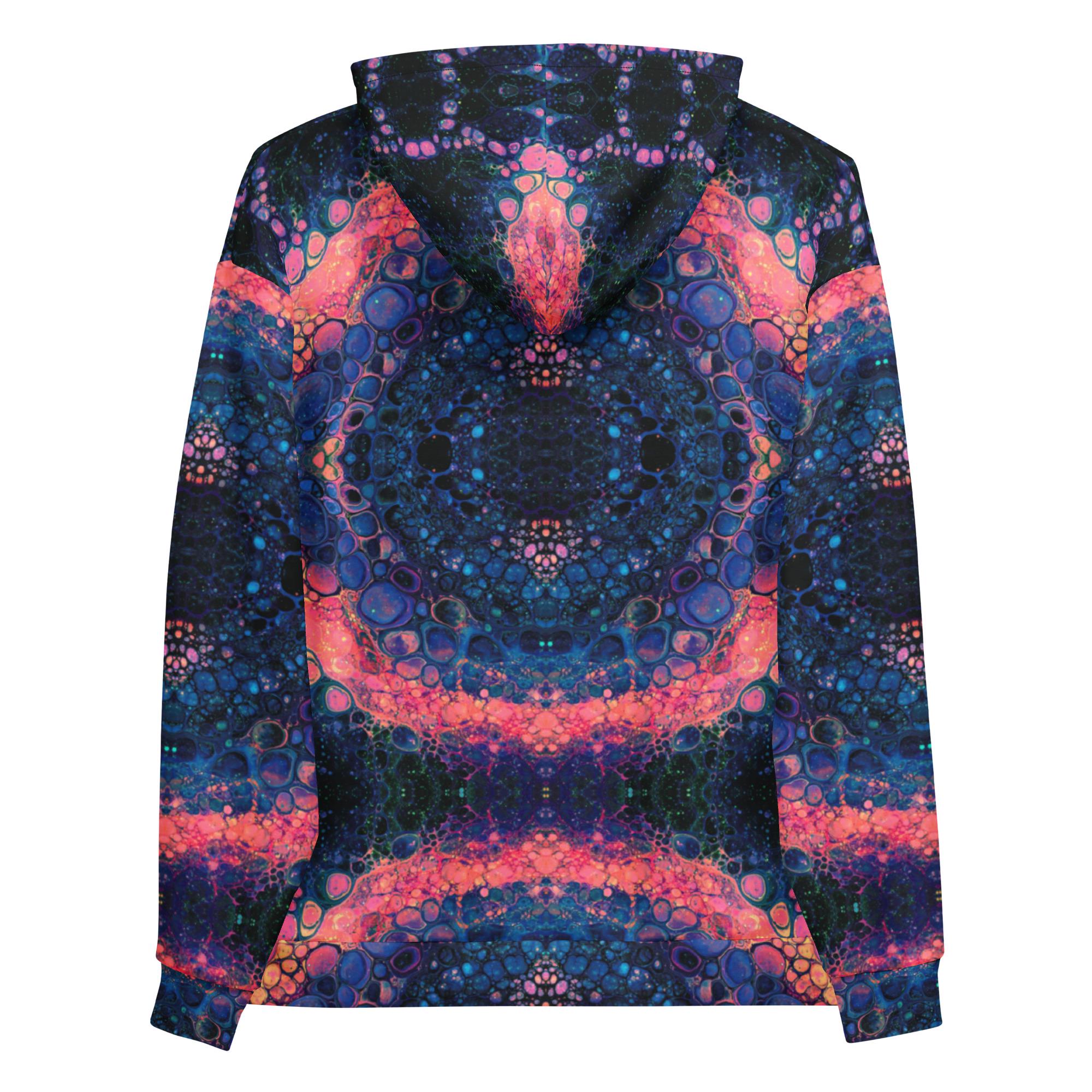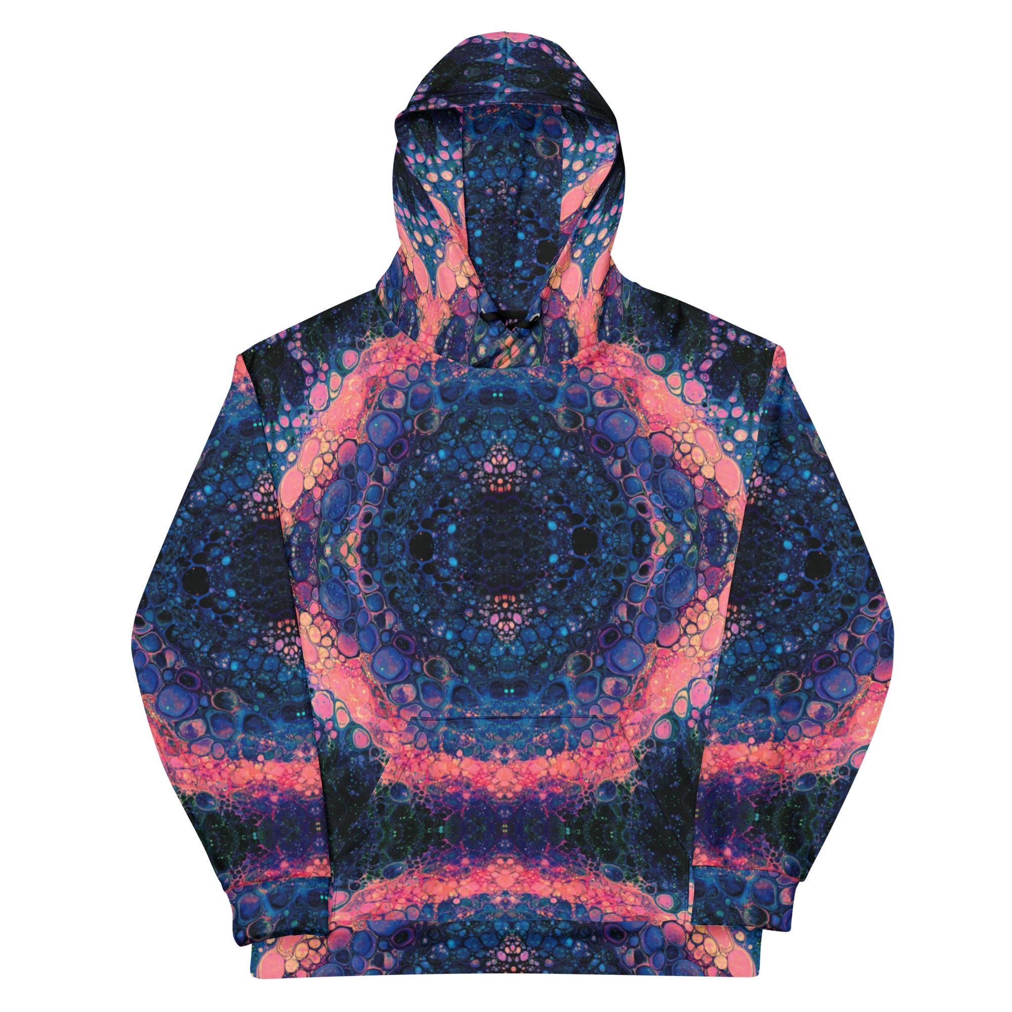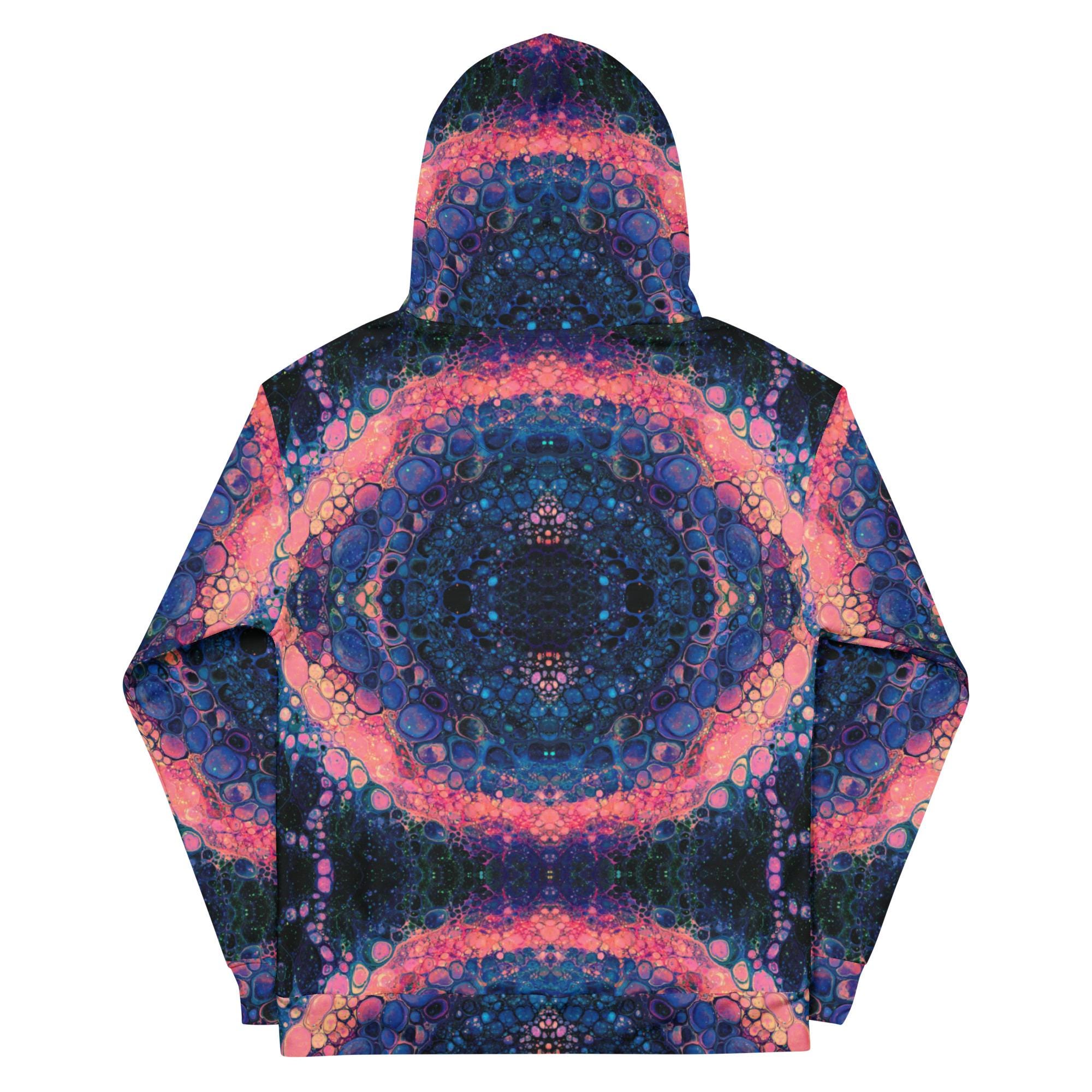 Key features include: * Eco-friendly materials with a focus on sustainability * Vibrant mandala and rose-inspired print in deep blue, orange, and pink tones * Soft brushed fleece interior for warmth and comfort * Unisex fit suitable for all genders * Double-lined hood with symmetrical design on both sides * Adjustable drawstrings for a personalized fit * Overlock seams for long-lasting wear