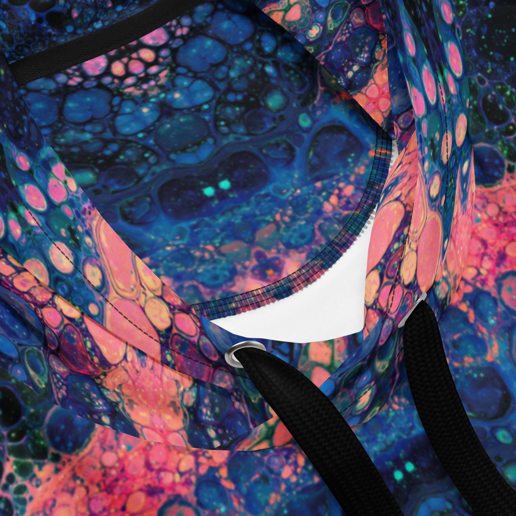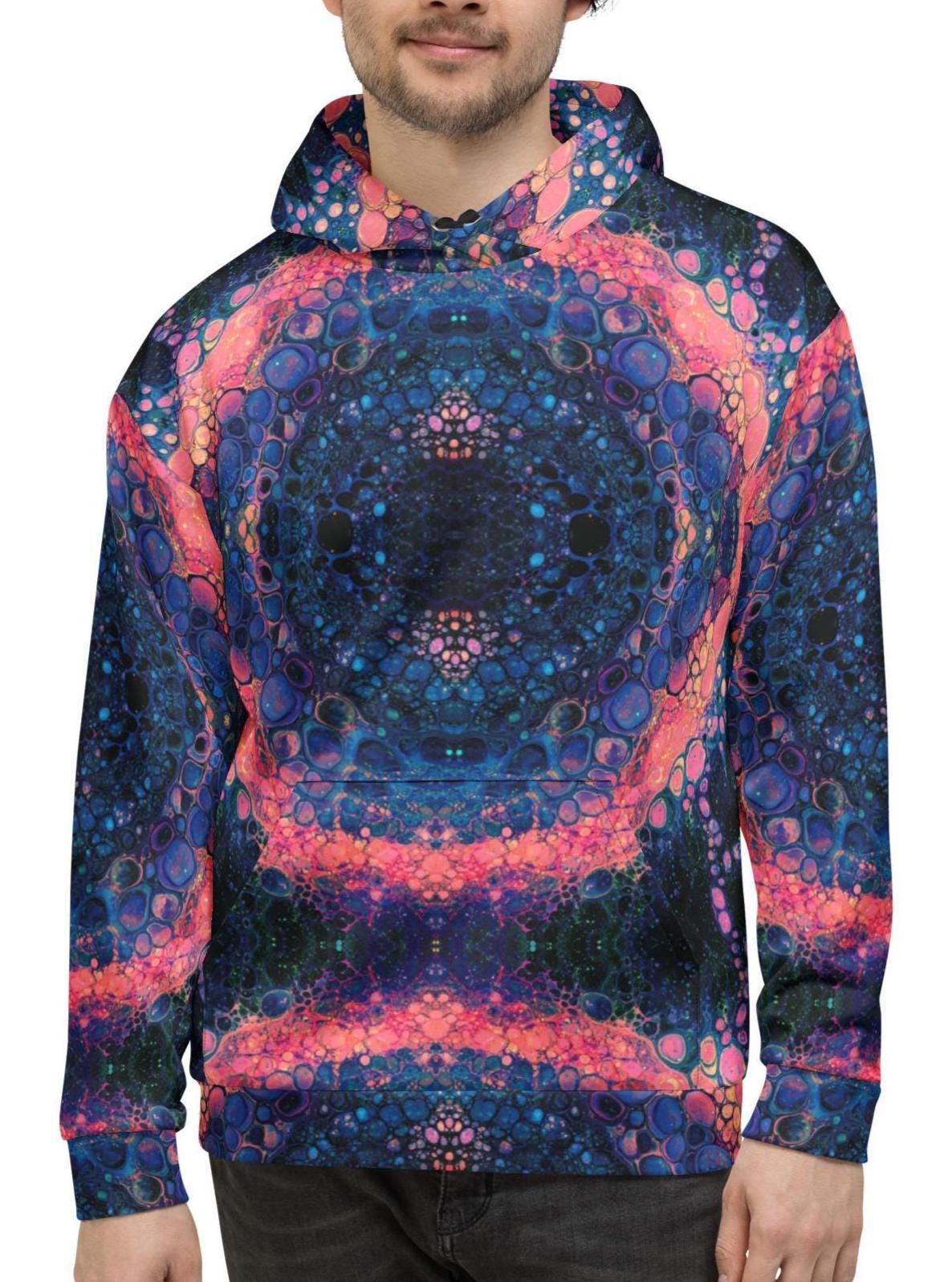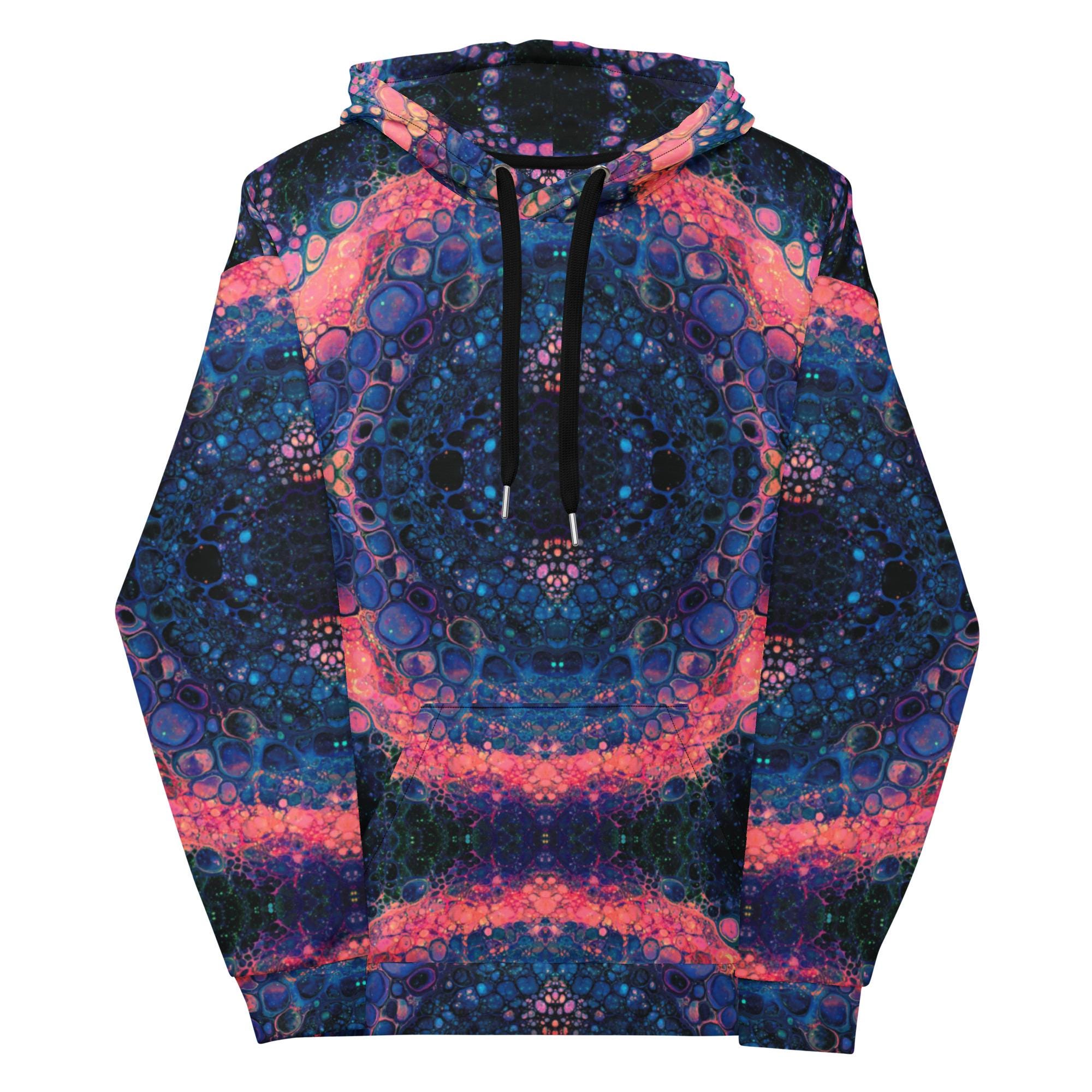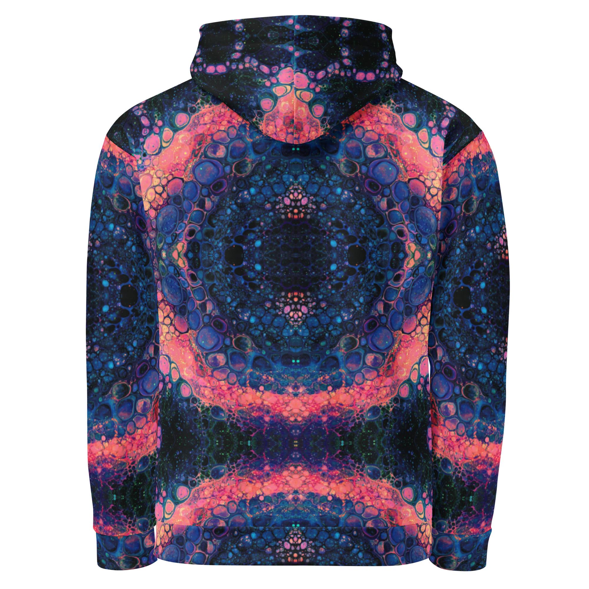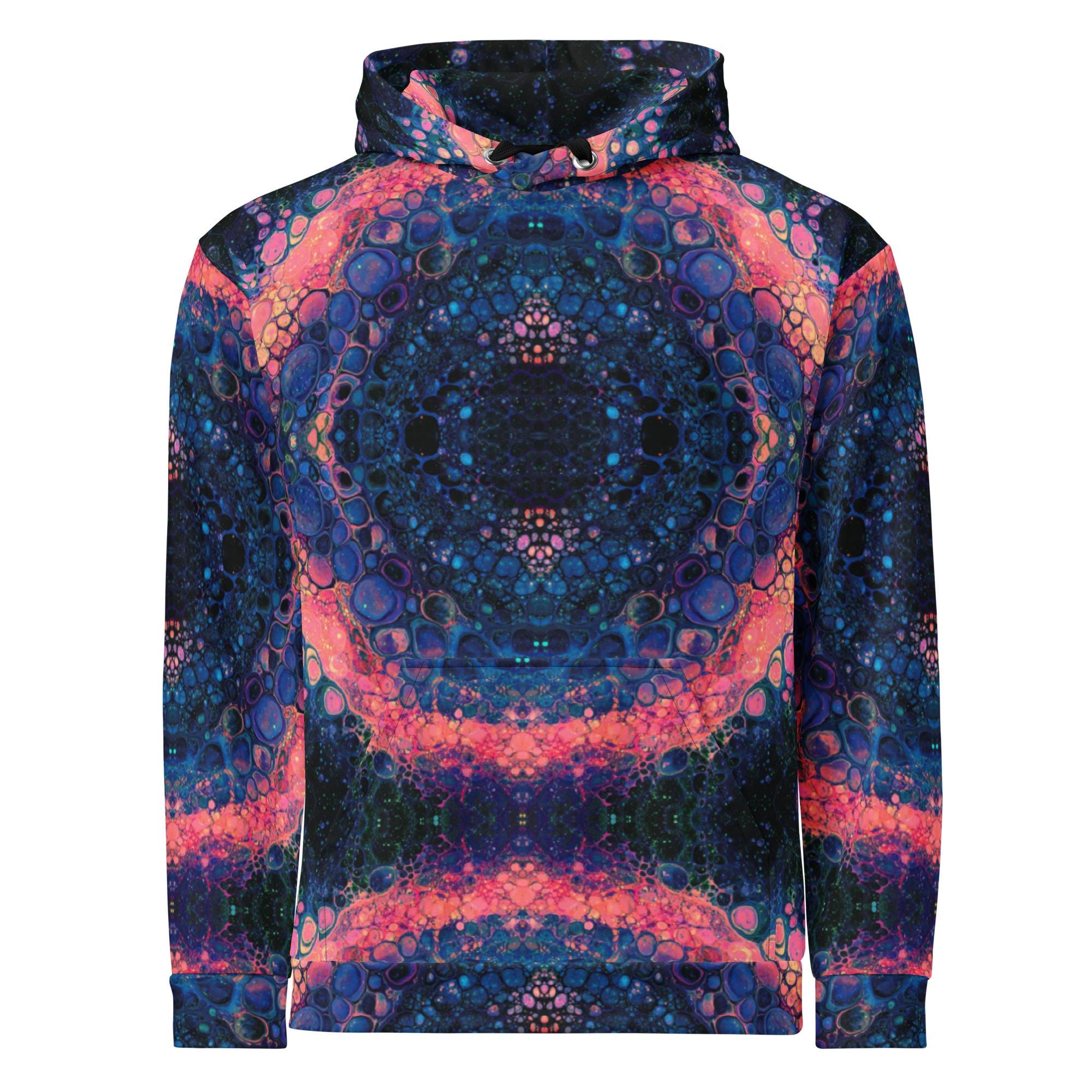 Key features include: * Eco-friendly materials with a focus on sustainability * Vibrant mandala and rose-inspired print in deep blue, orange, and pink tones * Soft brushed fleece interior for warmth and comfort * Unisex fit suitable for all genders * Double-lined hood with symmetrical design on both sides * Adjustable drawstrings for a personalized fit * Overlock seams for long-lasting wear