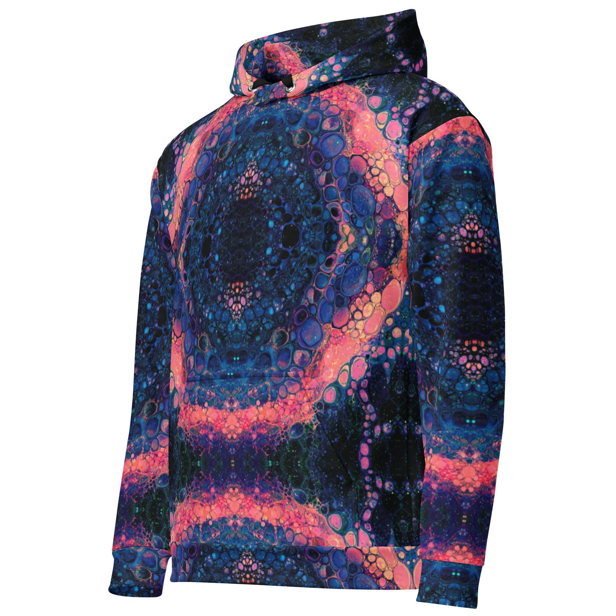 Made from a blend of 95% recycled polyester and 5% spandex, this hoodie offers a soft, cotton-feel fabric face that feels gentle against your skin. The brushed fleece interior provides added warmth and softness, making it your go-to layer for cooler days. The relaxed fit ensures all-day comfort, while the double-lined hood with the striking design on both sides adds a touch of artistry to your look. Drawstrings allow for adjustable comfort, and overlock seams enhance durability for everyday wear.