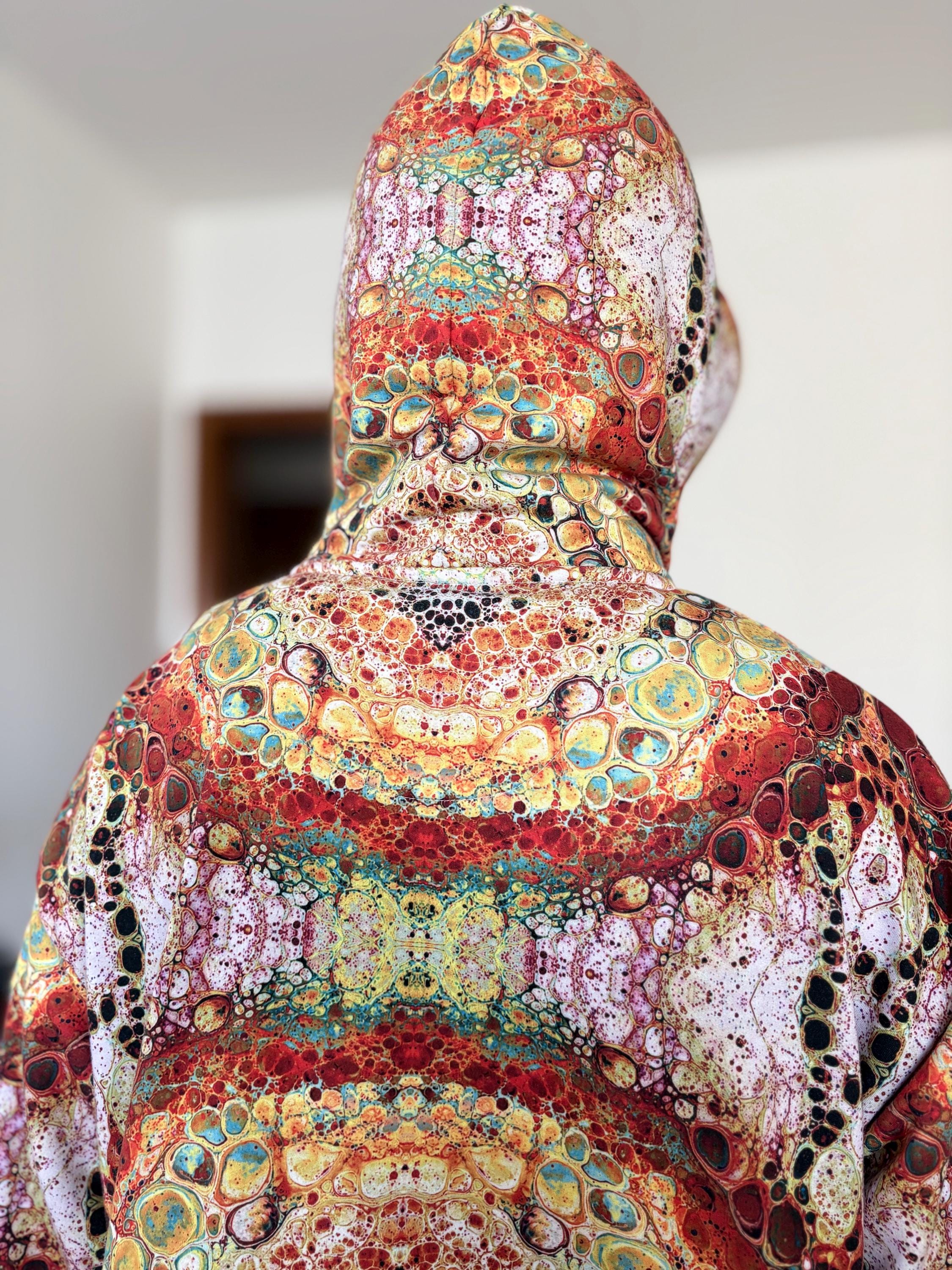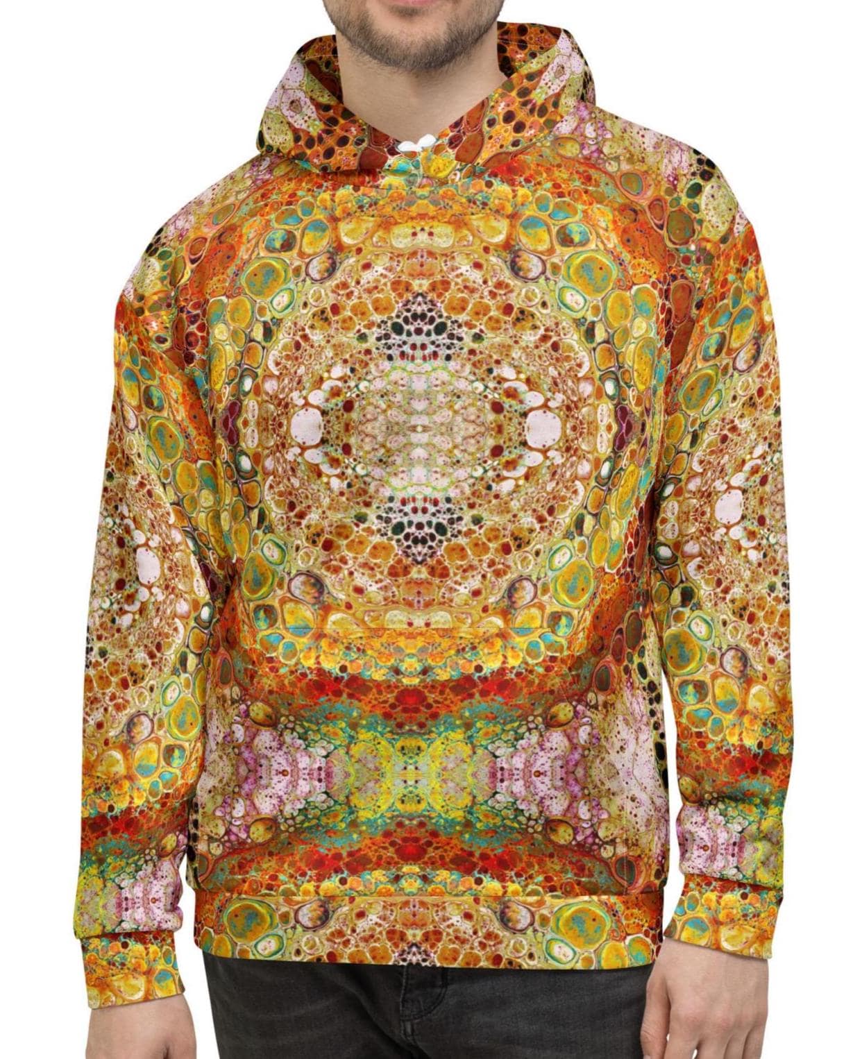 Key features: * Made from 95% recycled polyester and 5% spandex for eco-friendly comfort * Soft brushed fleece lining for warmth and coziness * Vibrant, psychedelic mandala print on the outside * Double-lined hood with design on both sides * Unisex style with relaxed fit * Includes adjustable drawstrings * Durable overlock seams for lasting quality * Fabric weight: 9.08 oz./yd.² (308 g/m²), ensuring a substantial feel